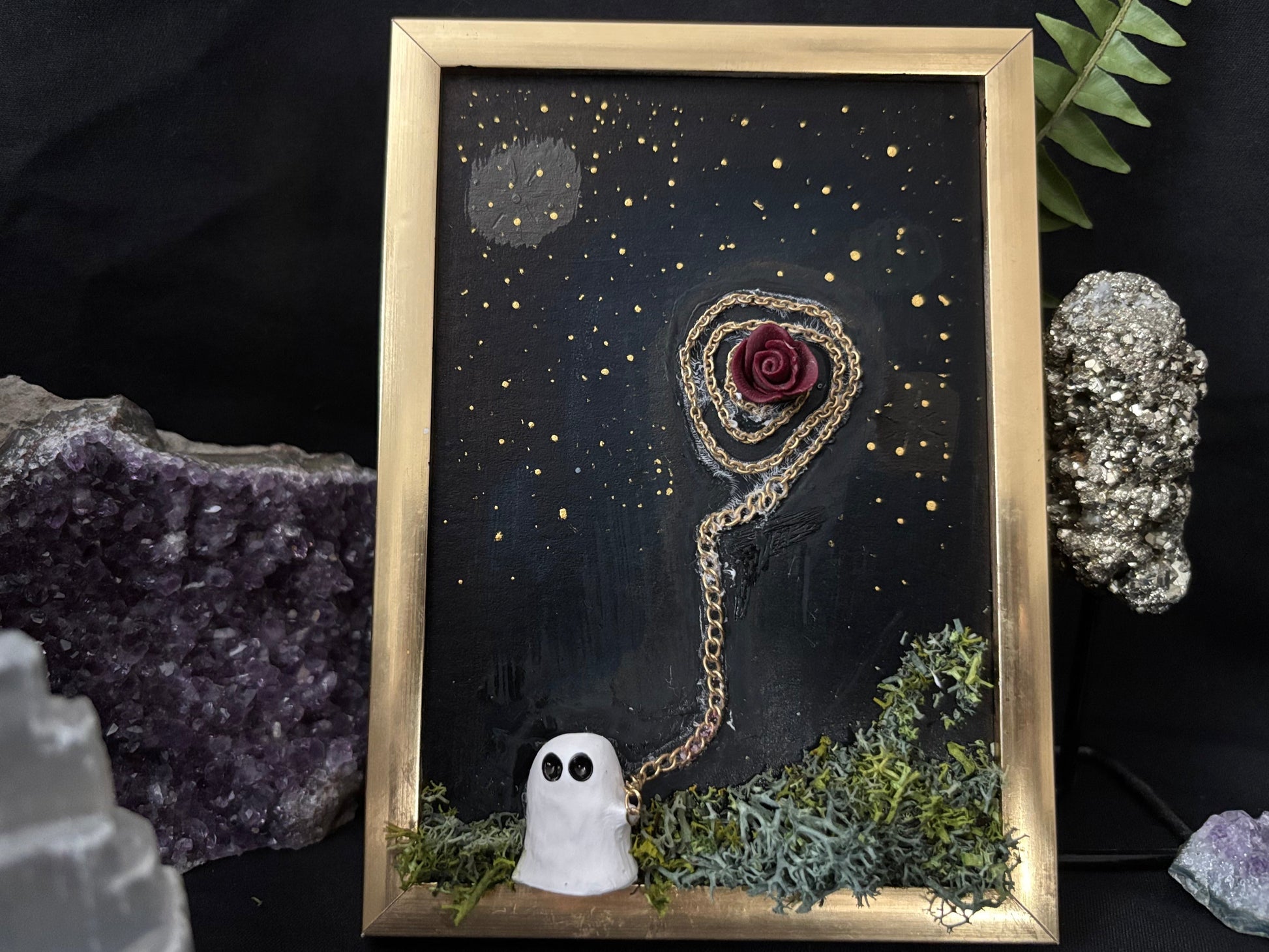 Meet Gloom & Glee, an irresistibly adorable whimsical ghost clutching a delicate rose balloon. Crafted from smooth polymer clay and nestled amidst lush preserved moss, this charming little figure is beautifully framed in gleaming gold. Its playful design brings a touch of magic and joy to any space, making it the perfect quirky treasure to brighten your day. 4" x 5 1/2"