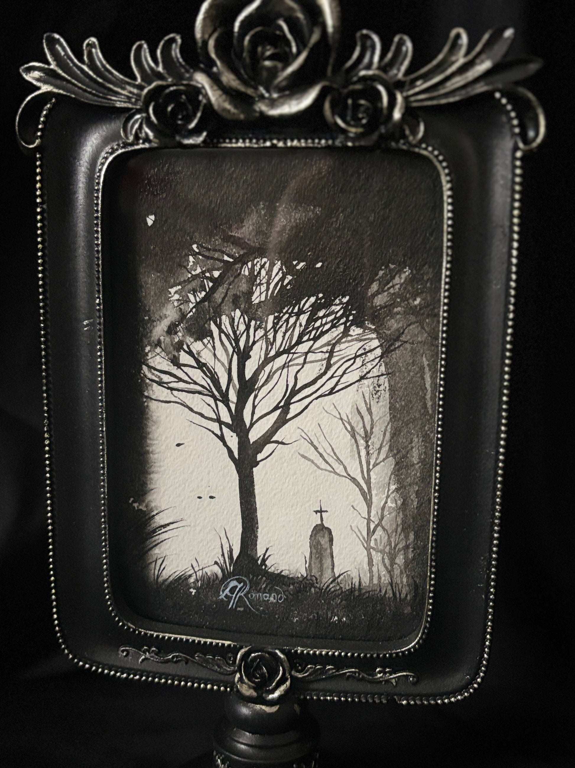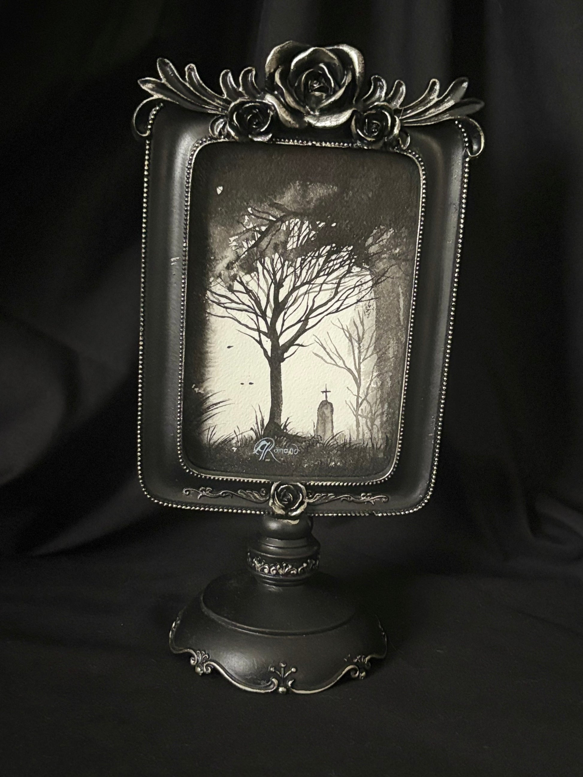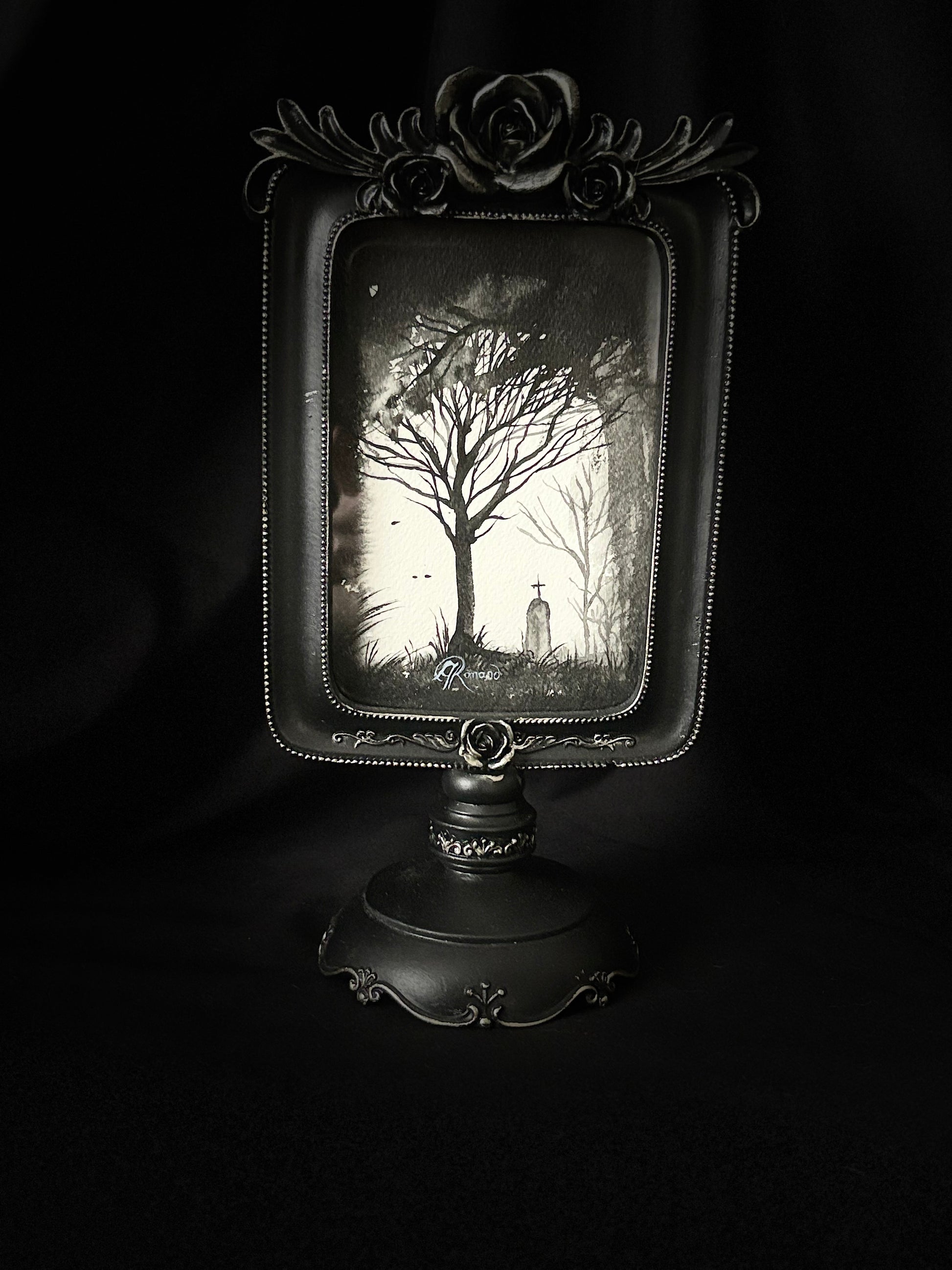 Restless captures the haunting beauty of mortality through Adam Romano's masterful brushwork. This evocative 4" x 6" framed piece features a gothic tree standing sentinel over a solemn grave, creating a poignant meditation on life's cycle. The intricate details and atmospheric composition make it an ideal addition to any crypt or dark aesthetic collection. A striking conversation piece that transforms any space into a gallery of contemplative art.